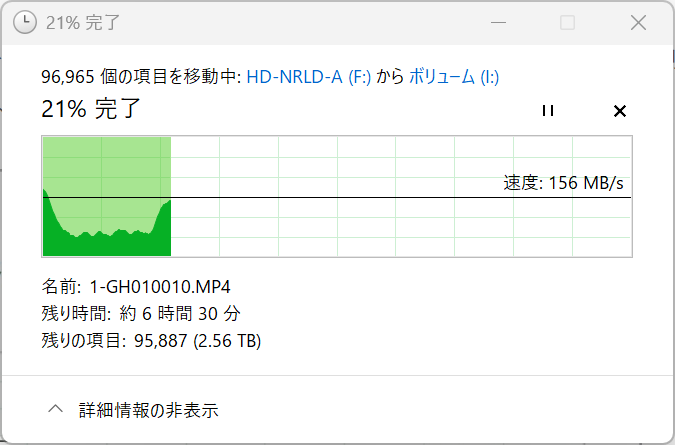 外付けHDDから今回のHDDスタンドへデータを移している最中の速度がこれ。大体140~160MB/sの速度で推移していた。速度が落ち込んでいる部分はデータ元のHDDにダブルタスクをさせていたせいなので、今回のHDDスタンドの性能とは無関係。
