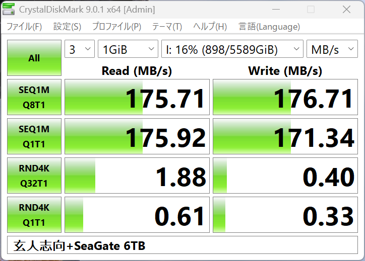 CrystalDiskMarkで速度を計測してみた結果がこれ。実はすでに3TBほど埋めた状態で測っているので最速では無いだろうが、とりあえずHDDとしては問題ない数字が出る。
