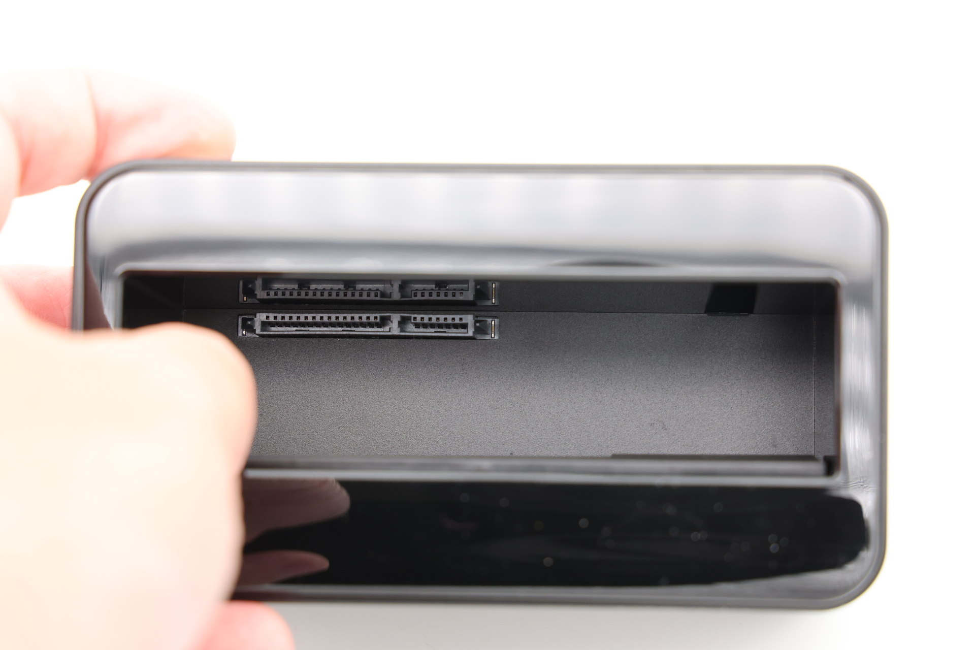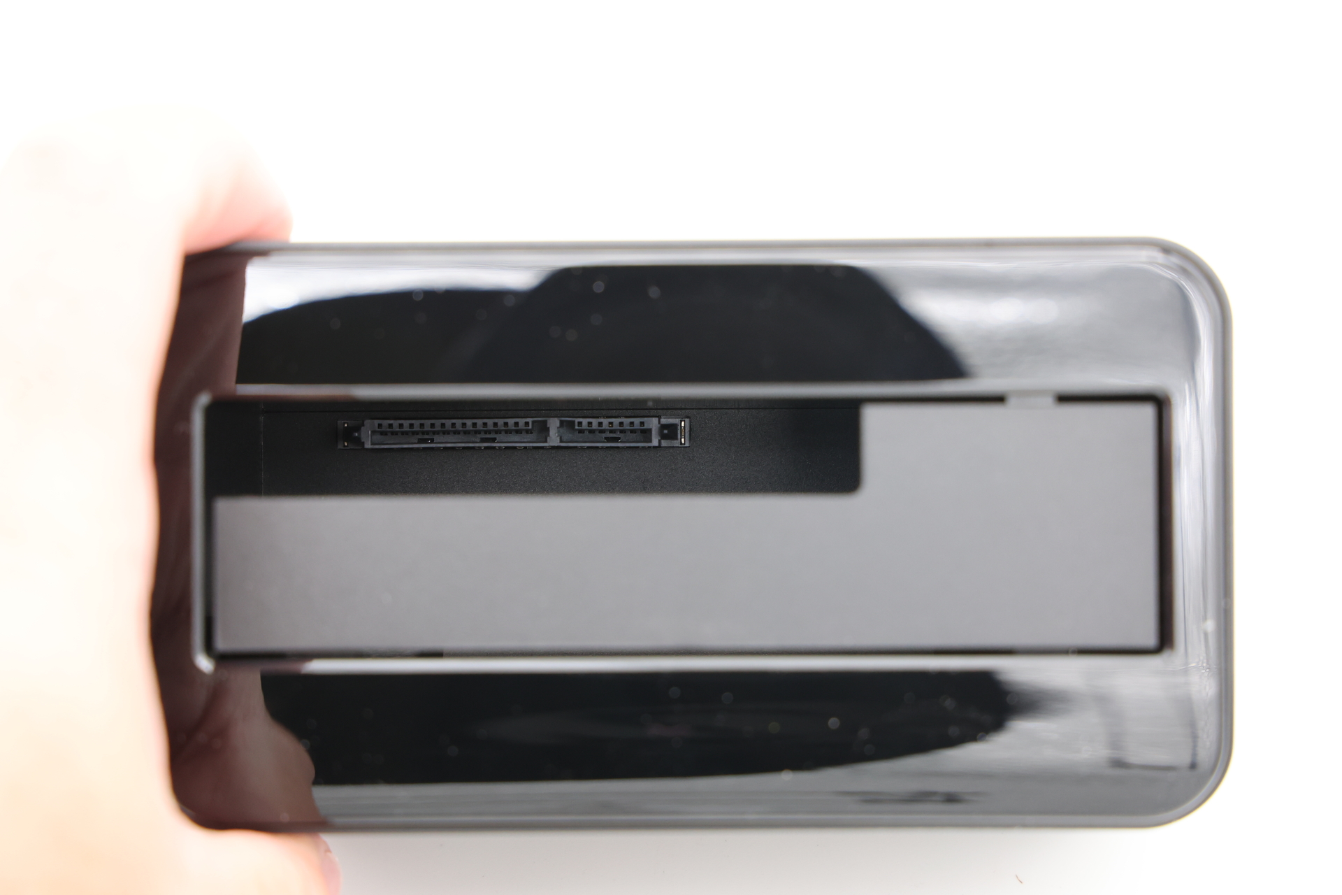中身もめちゃくちゃシンプルで、2.5インチまたは3.5インチのHDDやSSDが挿さるだけ。ネジ止めなど一切なしで潔い。