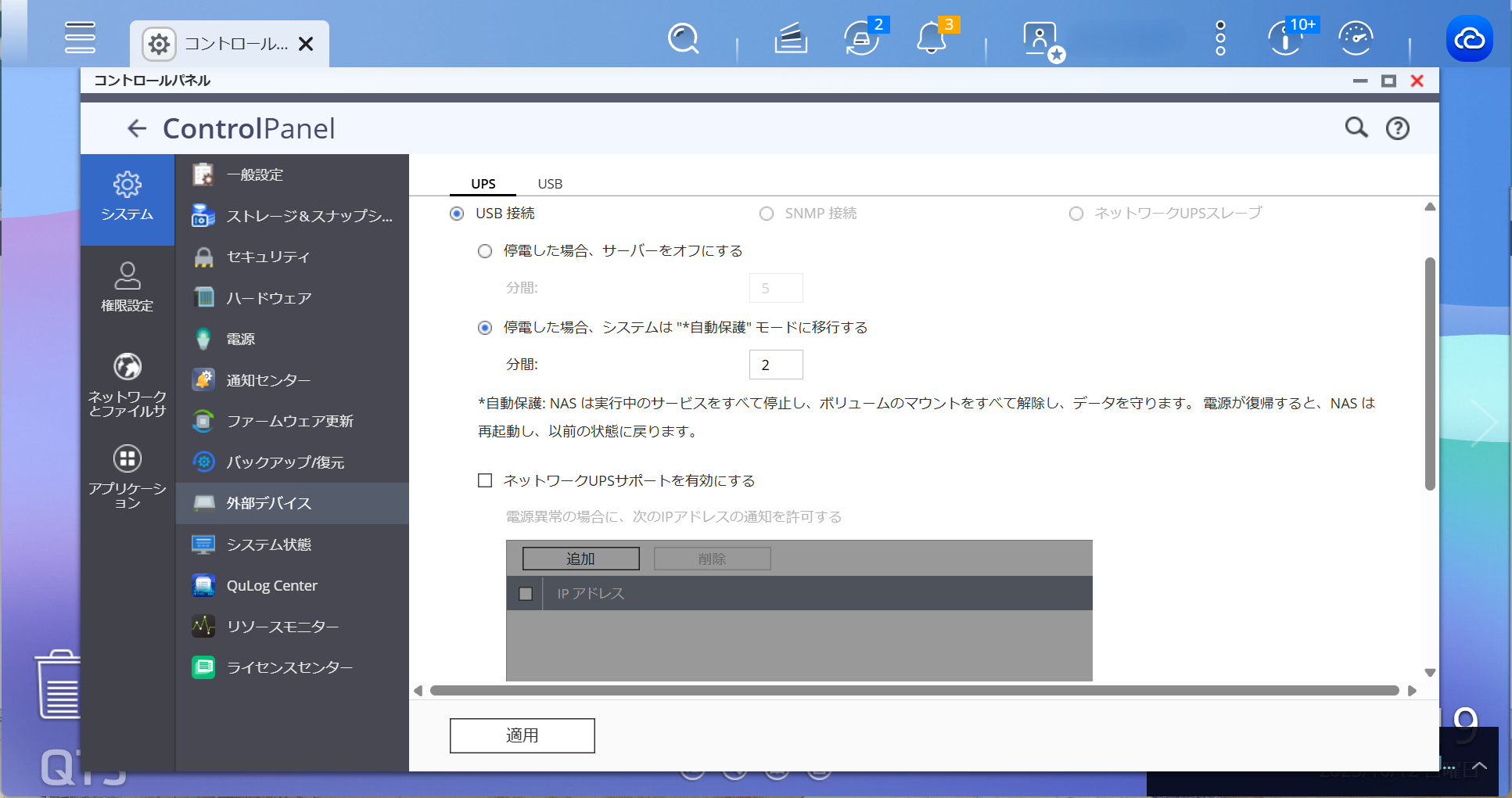 の2つが選べるので、今回は自動保護モードを選択した。自動保護モードに移行するまでの時間(UPSの電源だけで駆動する時間)は初期が2分。その後は自動でシャットダウンし、電源が復帰したら自動でNASを再起動させてくれる。