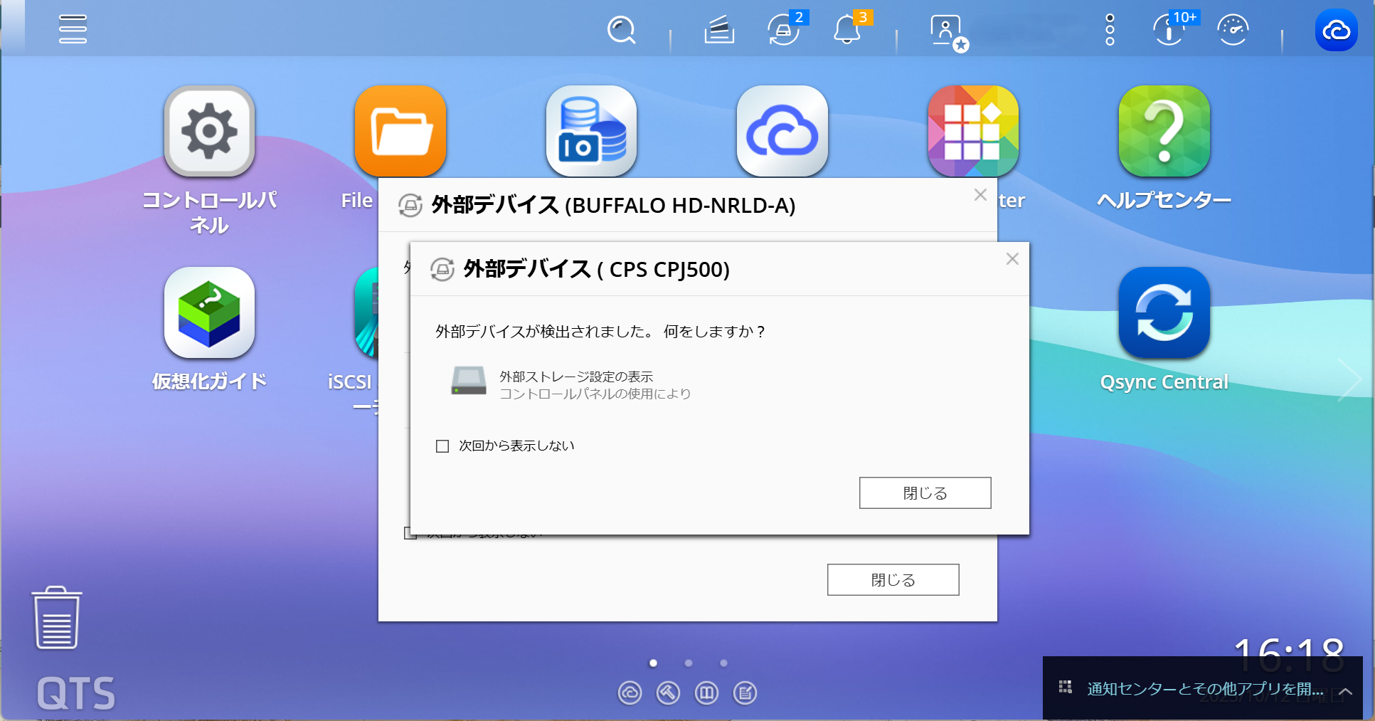 まずNASのダッシュボードを開くと、自動で外部デバイスが検出されたという画面が表示される。