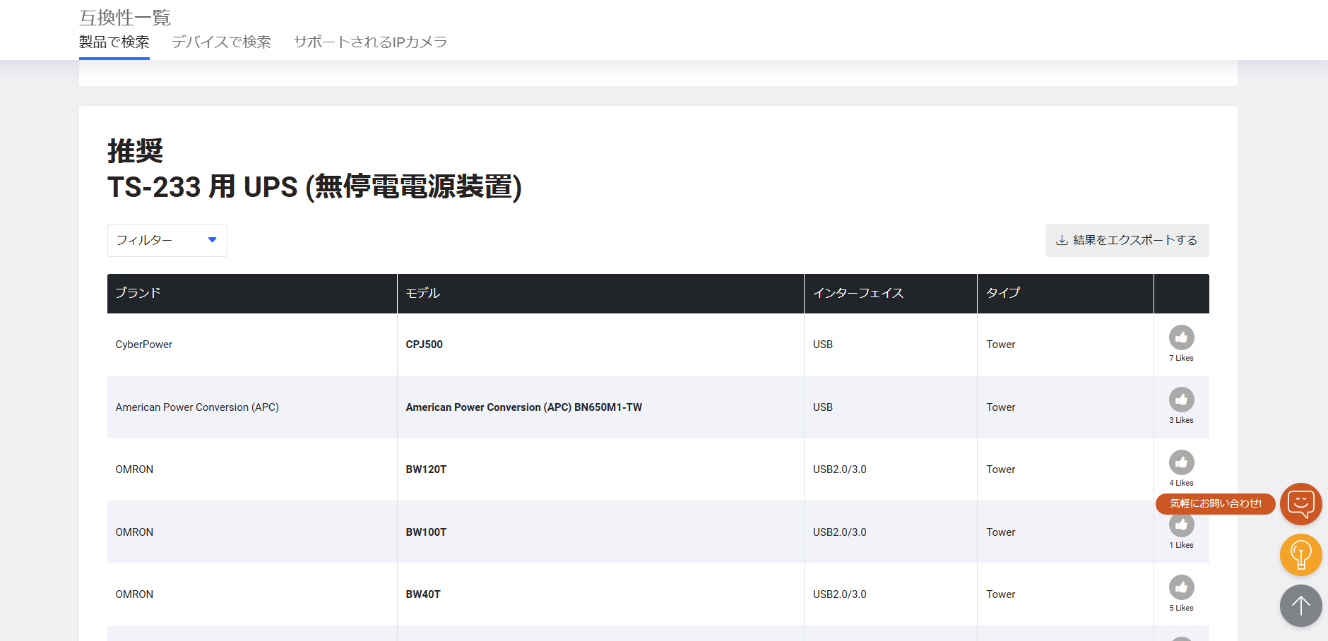 QNAPの場合は各NASに使える推奨UPSがWebサイトの互換性一覧ページに掲載されている。割と様々な種類があるが、今回はNASとその周辺機器を保護できれば十分なので、比較的安価で小型なモデルを選択した。