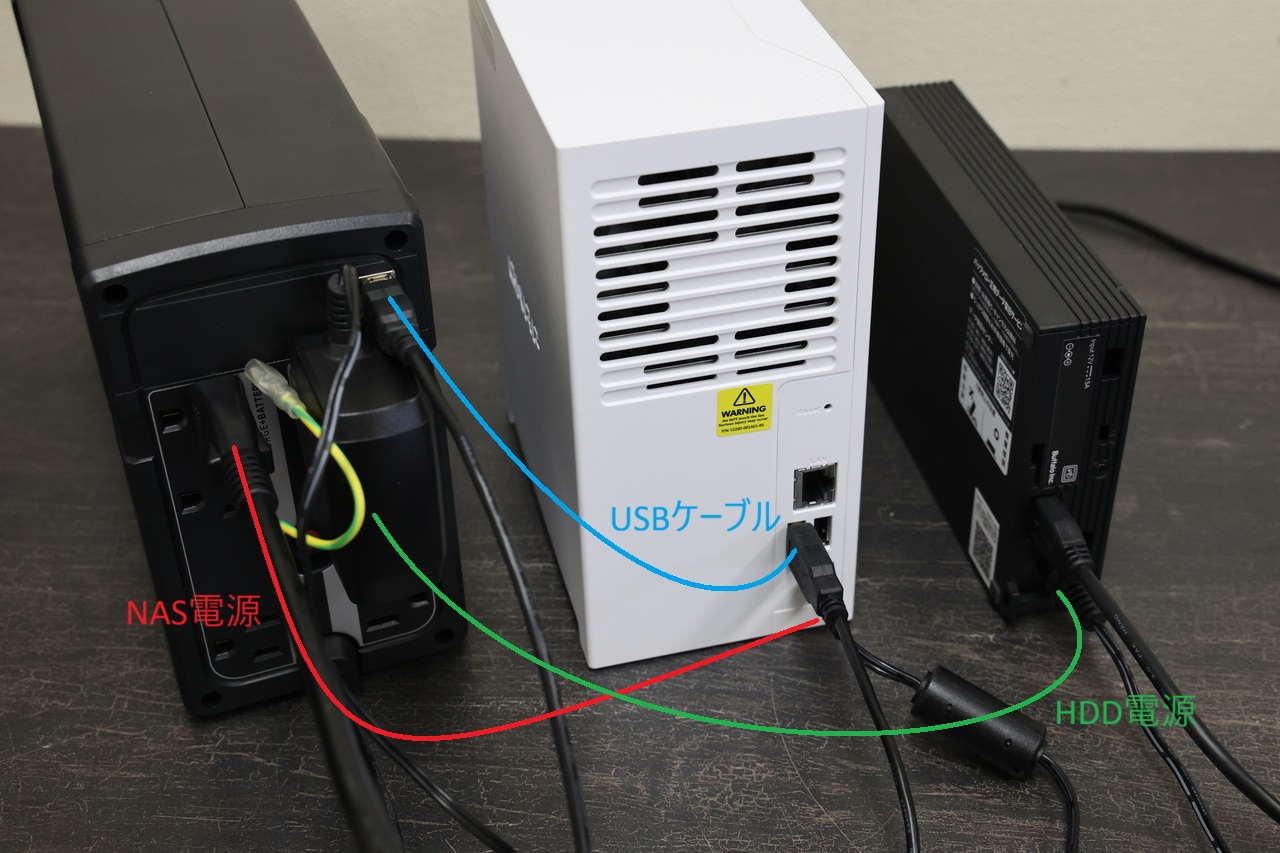 たったこれだけ。はじめにも言った通り、これまでコンセントに繋いでいた電源ケーブルをUPSのコンセントに挿せばいいだけ。またUPSの特徴としてUSBケーブルがあるので、これをNASに繋ぐことで電源喪失時の挙動を制御することができる。