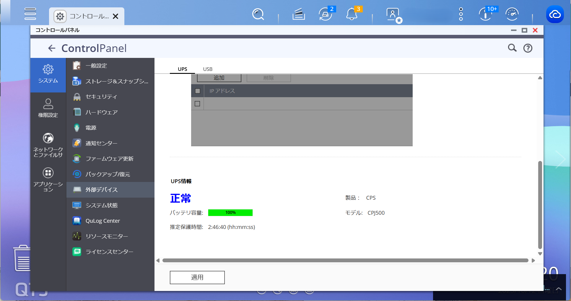 今回CyberPower CPJ500と接続したQNAPのNAS TS-233の場合、UPSとの連携はメチャクチャ簡単。