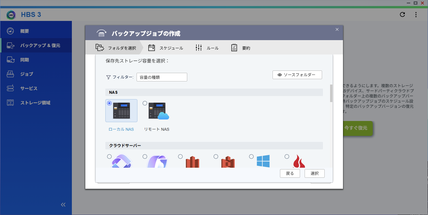 次に保存先ストレージを選択。クラウドサーバーなども選べるが、今回は外付けHDDに保存したいので「ローカルNAS」を選択する。