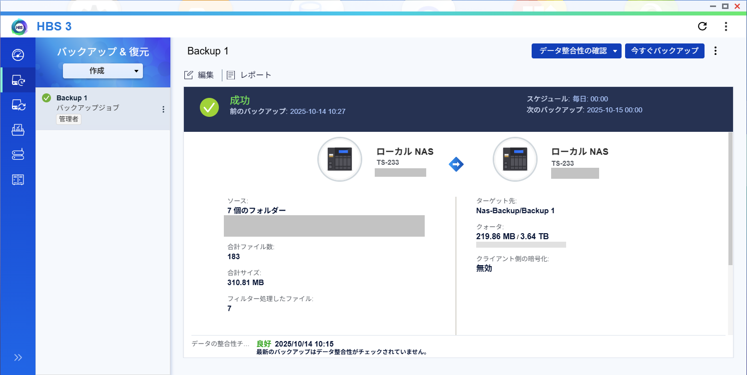 バックアップジョブが作成できた。「今すぐバックアップ」を押すと手動でバックアップを作成してくれる。