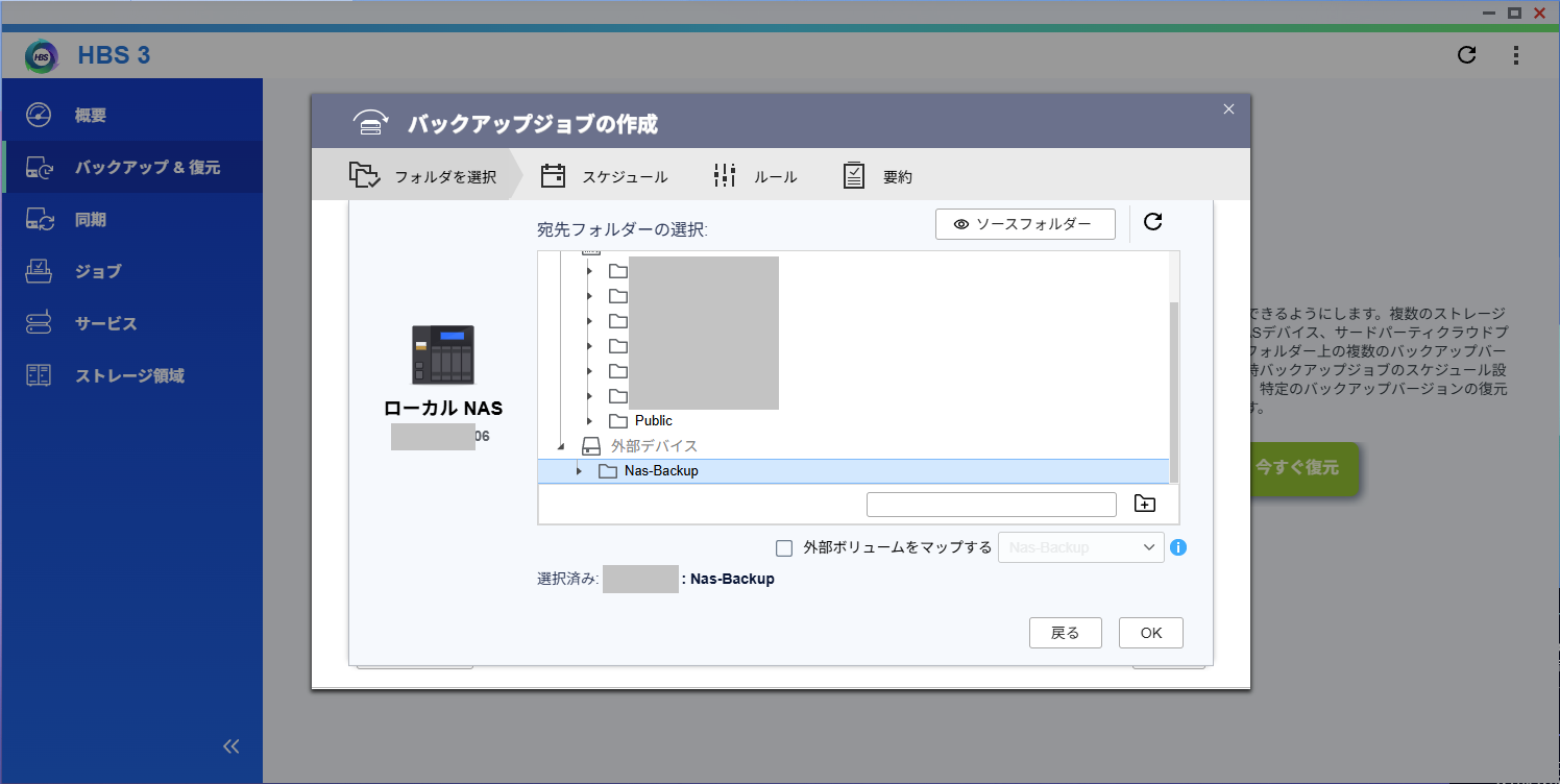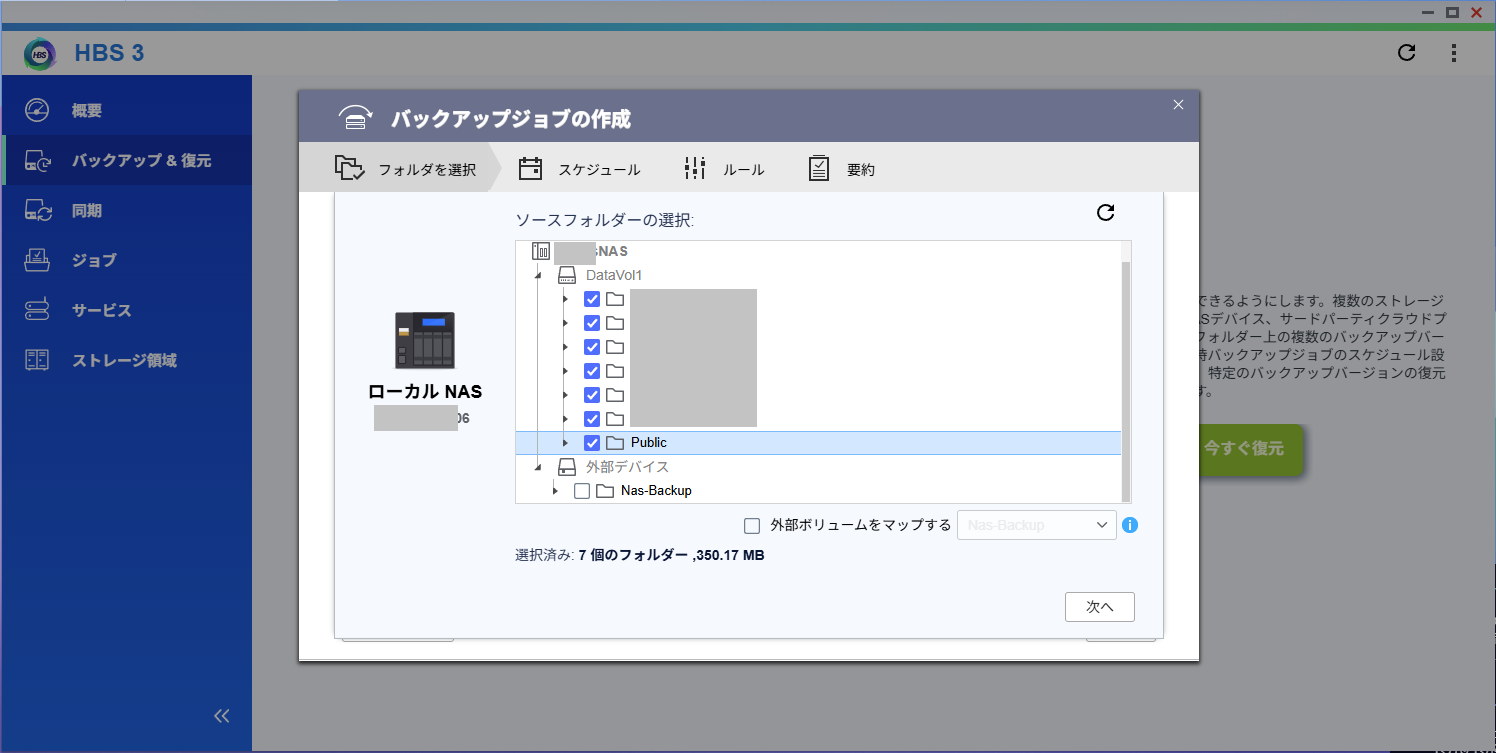 まずはバックアップを取りたいファイルを選択する。今回はNAS内の全データのバックアップを取りたかったので、すべての共有ファイルを選択した。