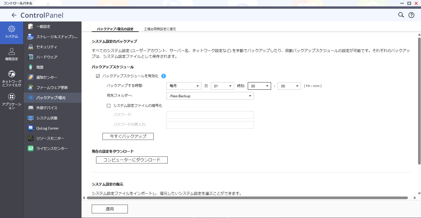 コントロールパネルの「バックアップ/復元」からはシステム設定のバックアップが取得できる。