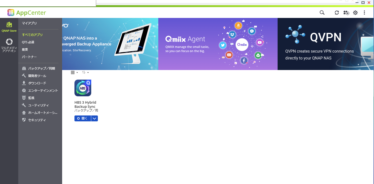 まず管理画面のAppCenterで「Hybrid Backup Sync」と検索して、インストールする。このブログを書いている時点で最新版はHBS 3という名前だった。以下HBSと呼ぶ。