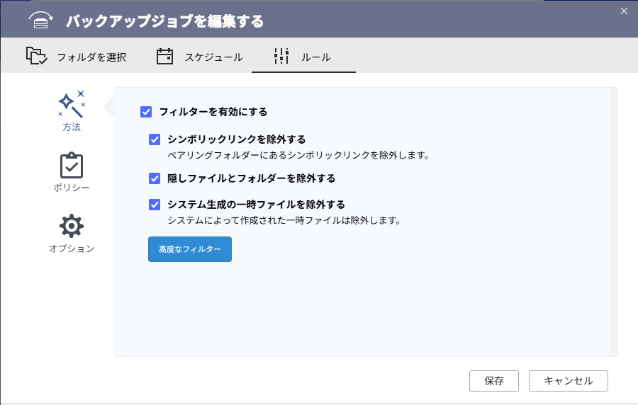 スケジュール設定ができたらルールを設定する。隠しファイルや隠しフォルダーを除外シたくない場合にはチェックを外す。